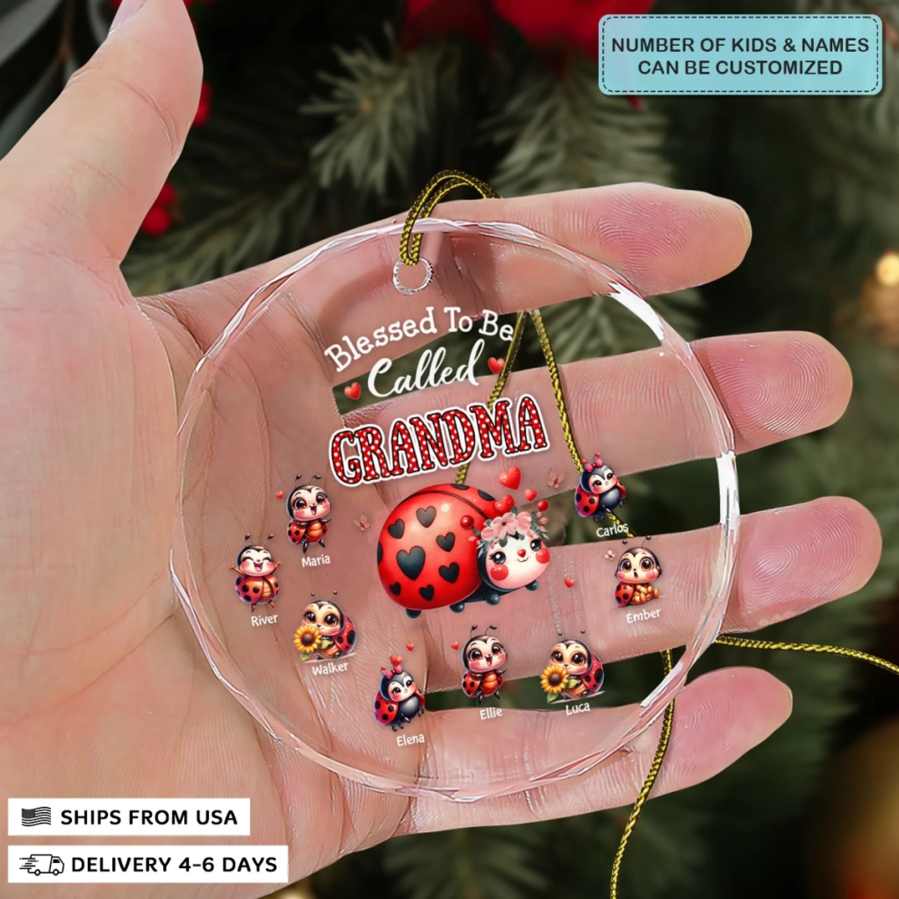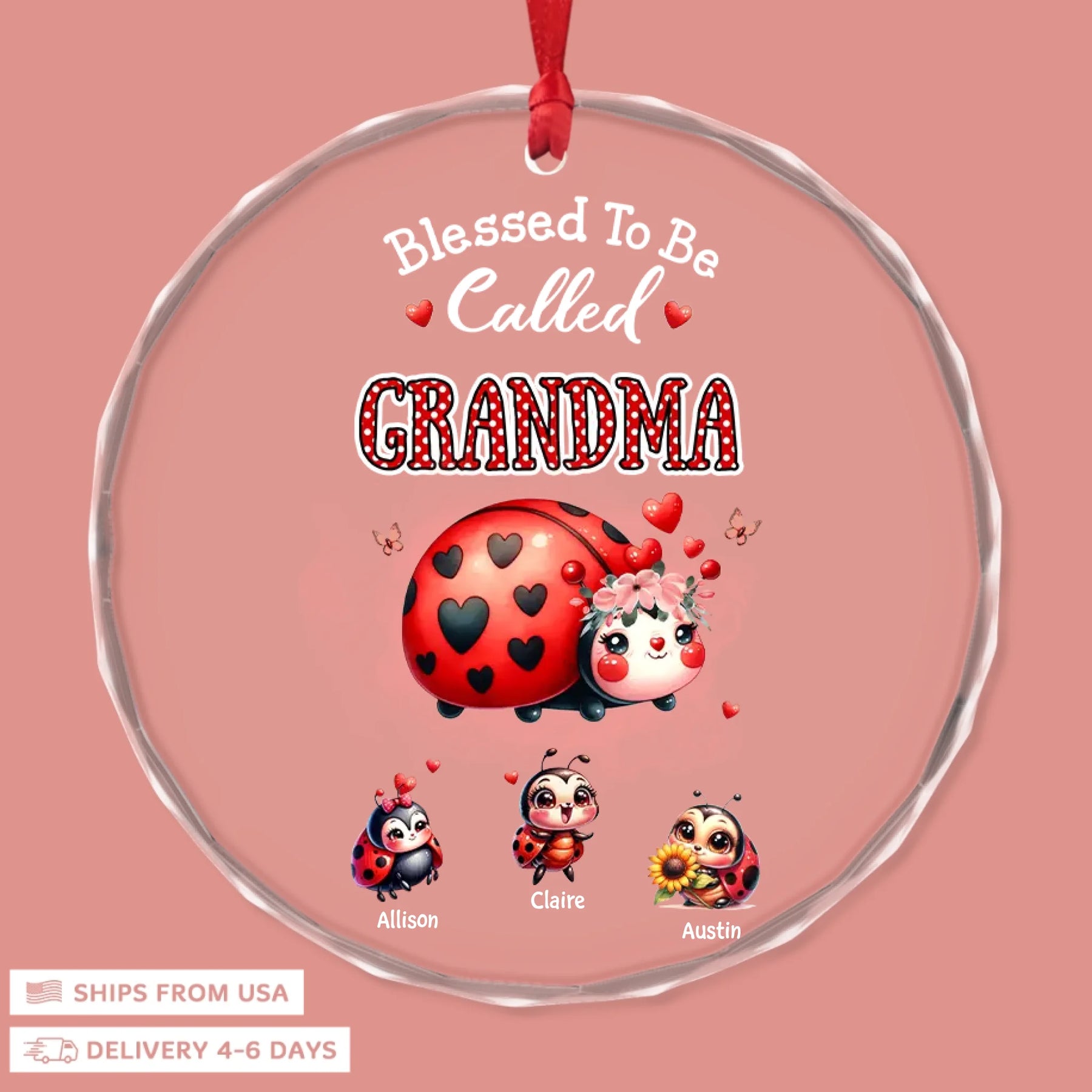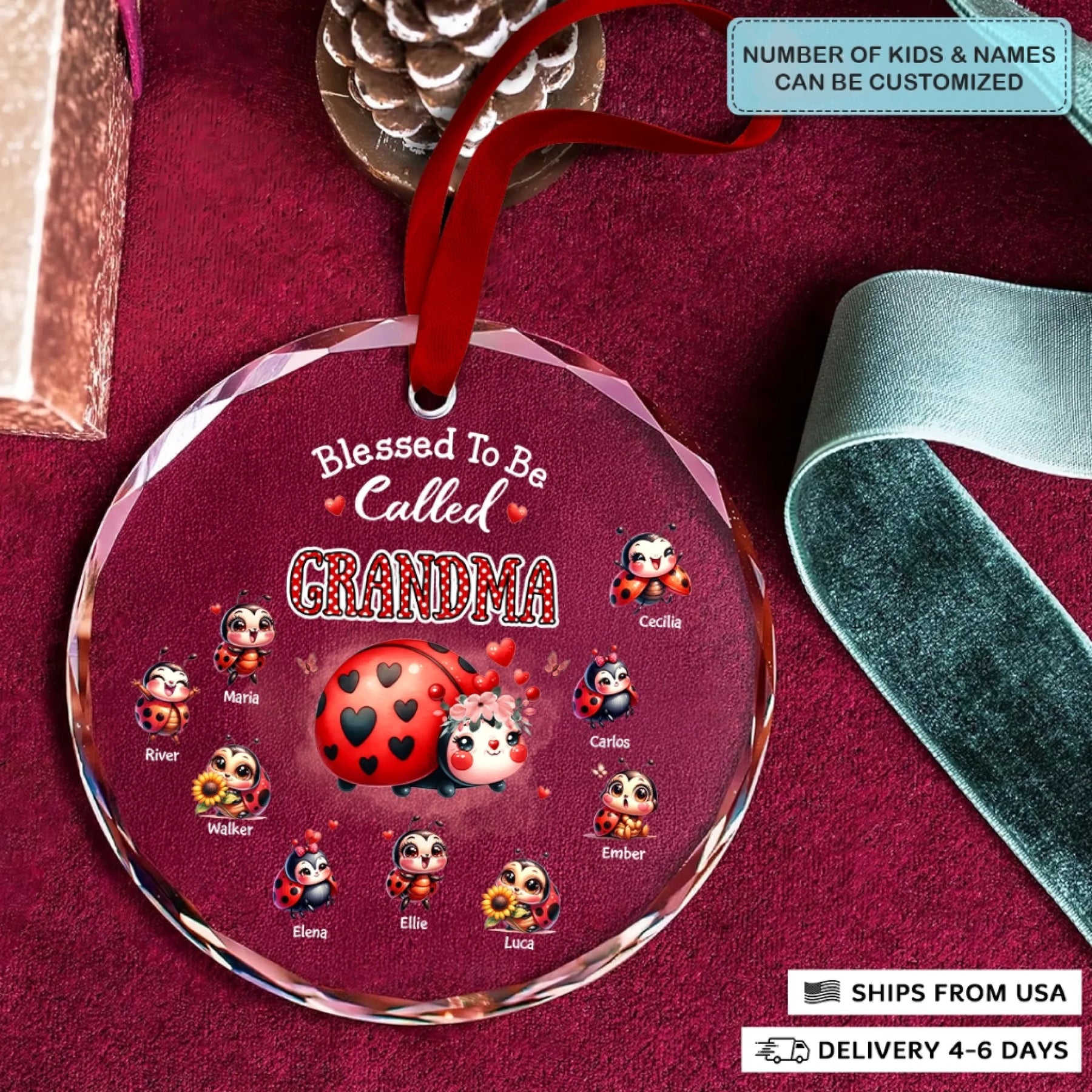 - Packaging: Red satin ribbon for hanging included