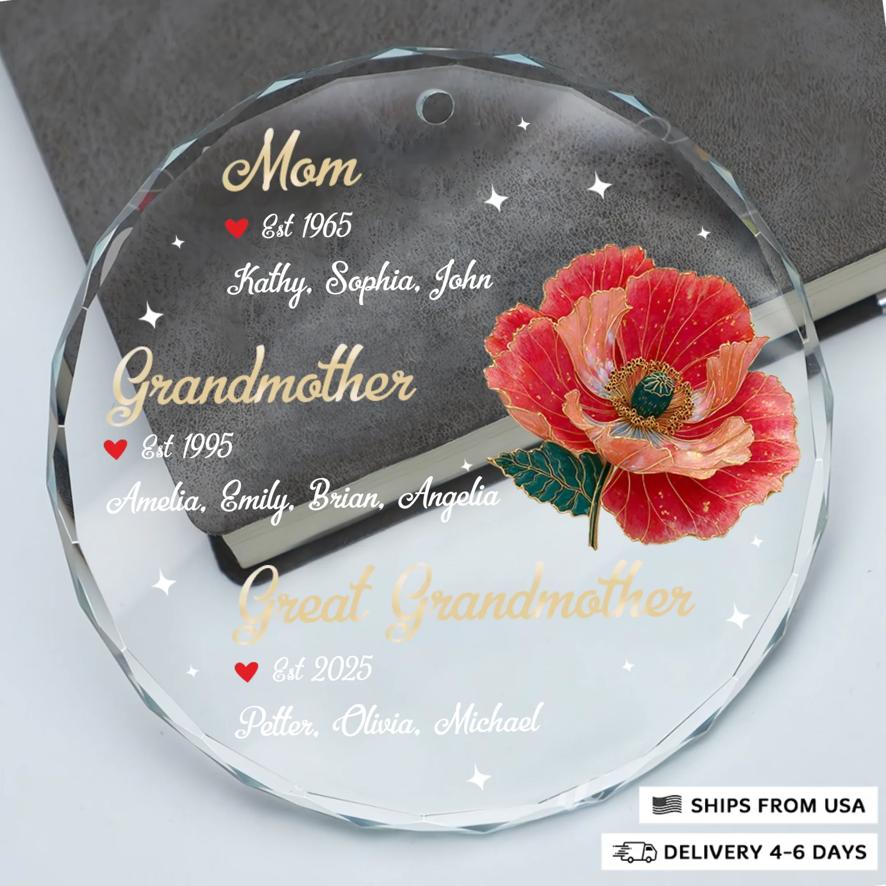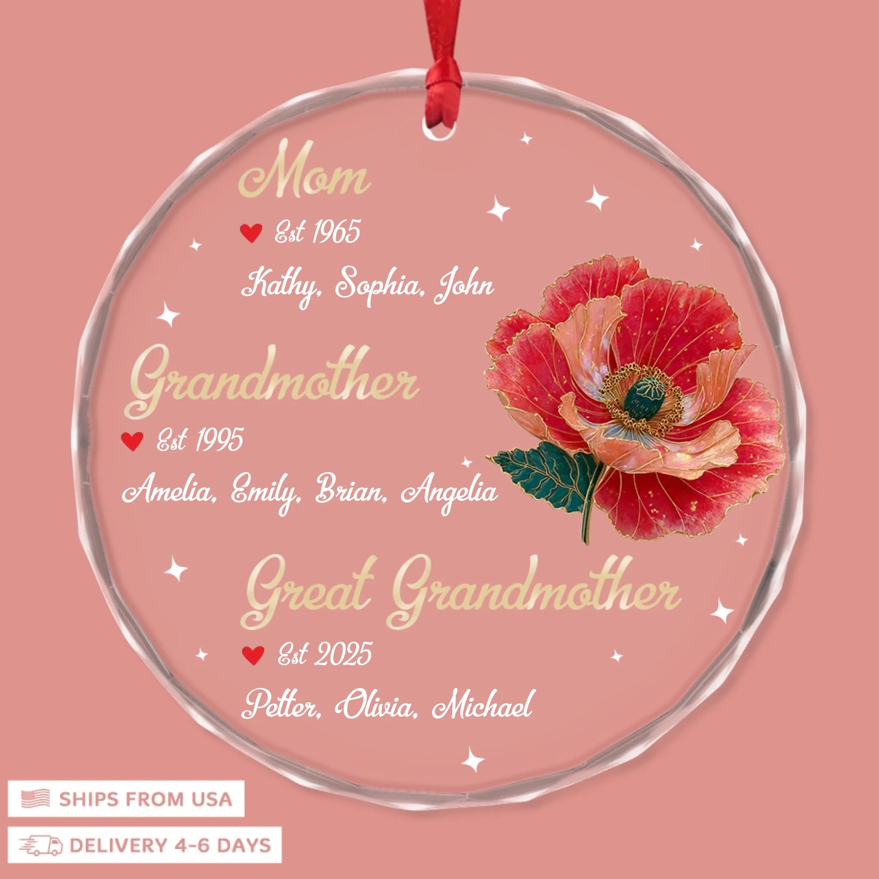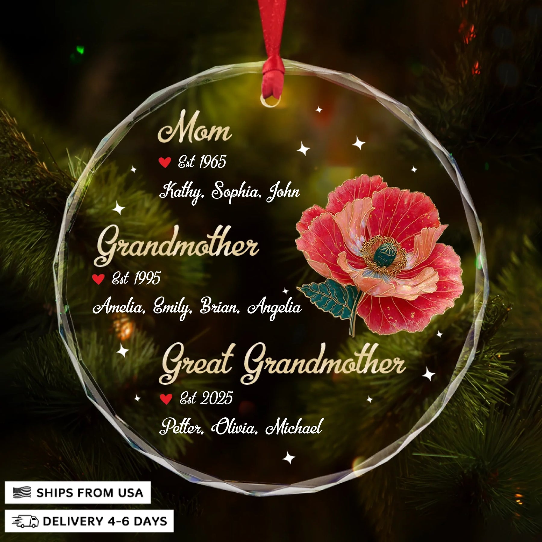 - Packaging: Red satin ribbon for hanging included