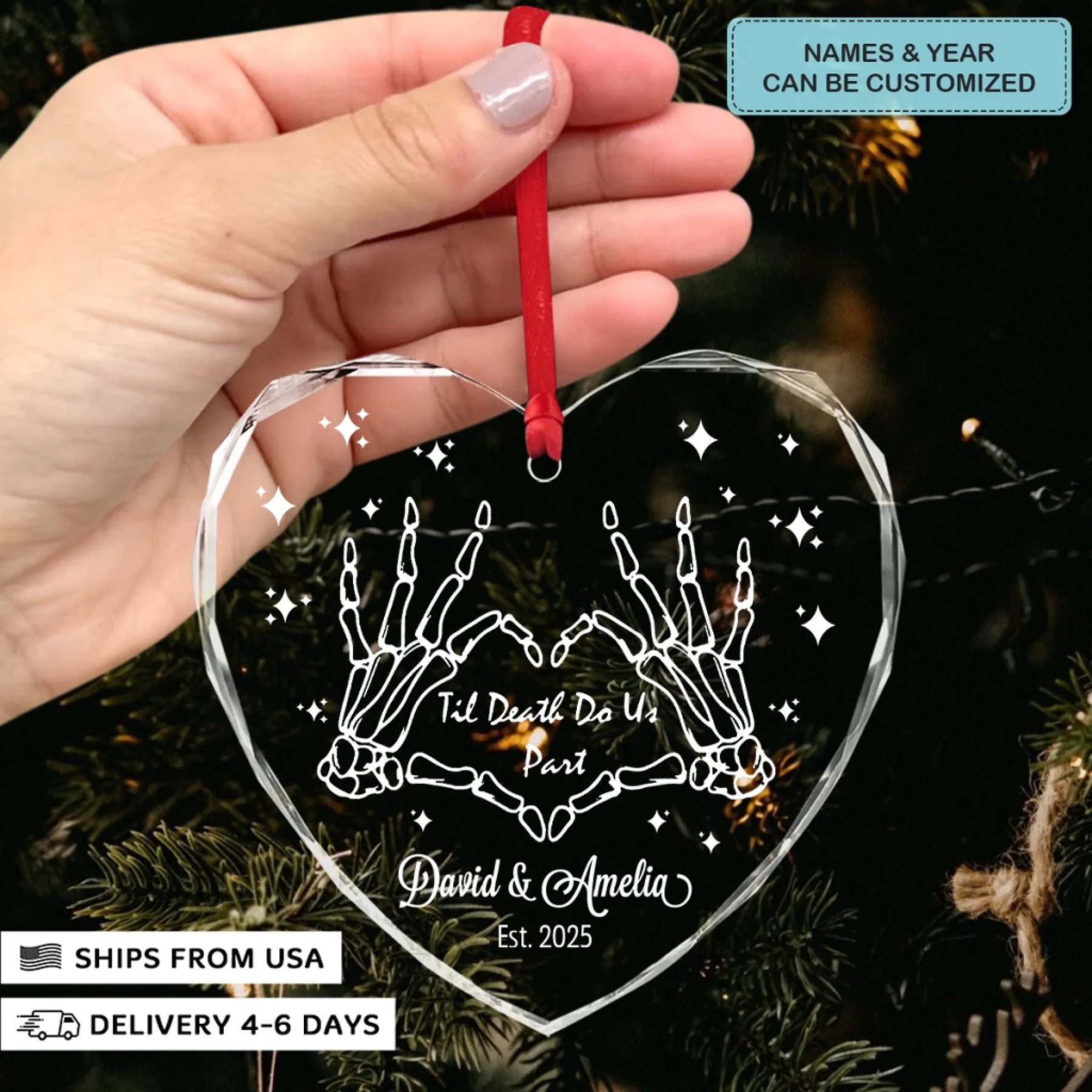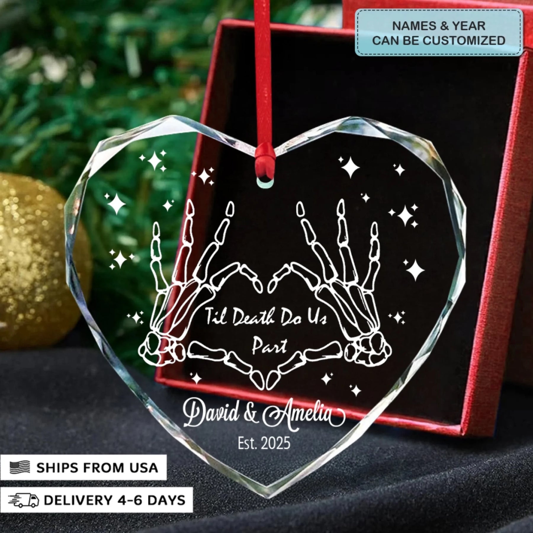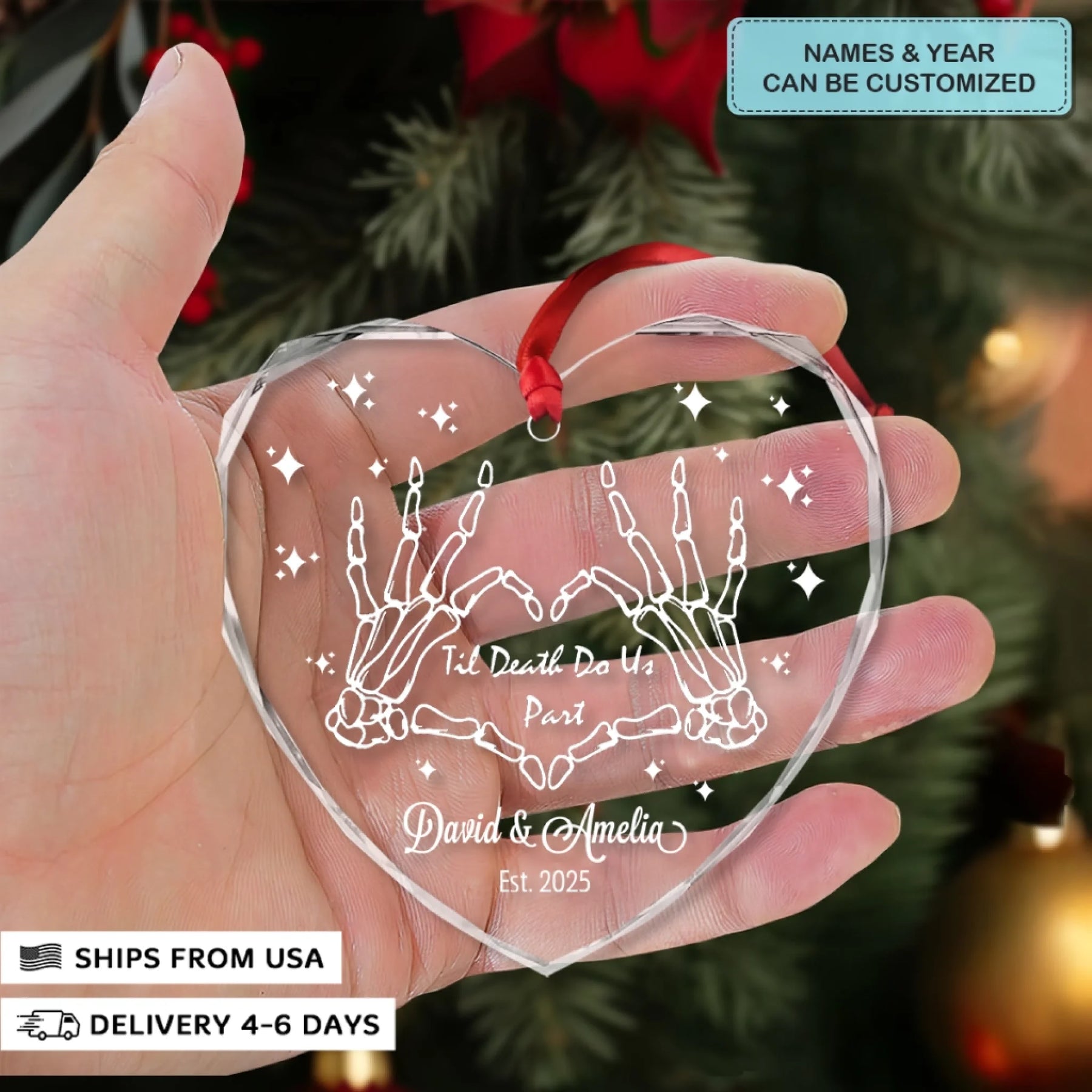 - Packaging: Red satin ribbon for hanging included