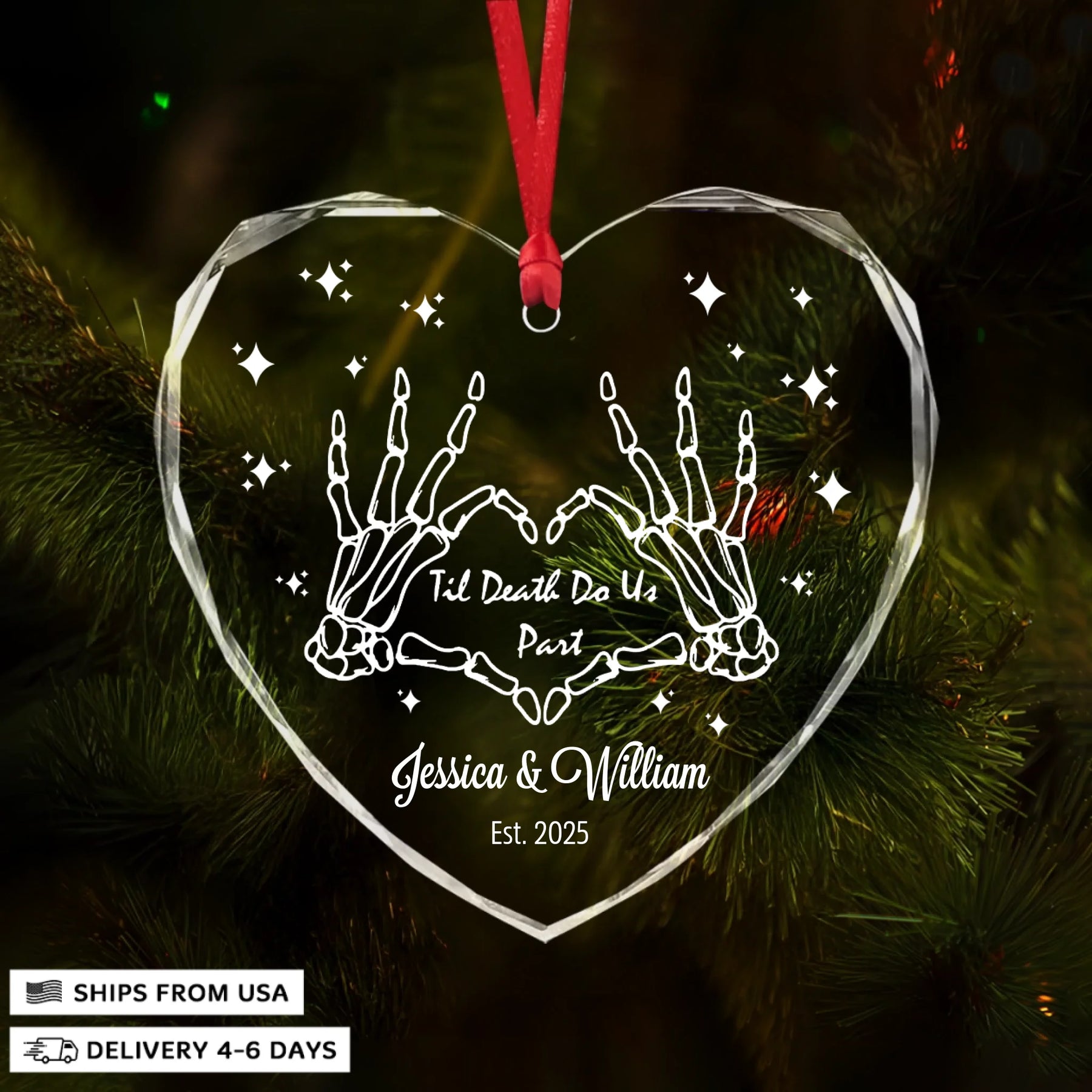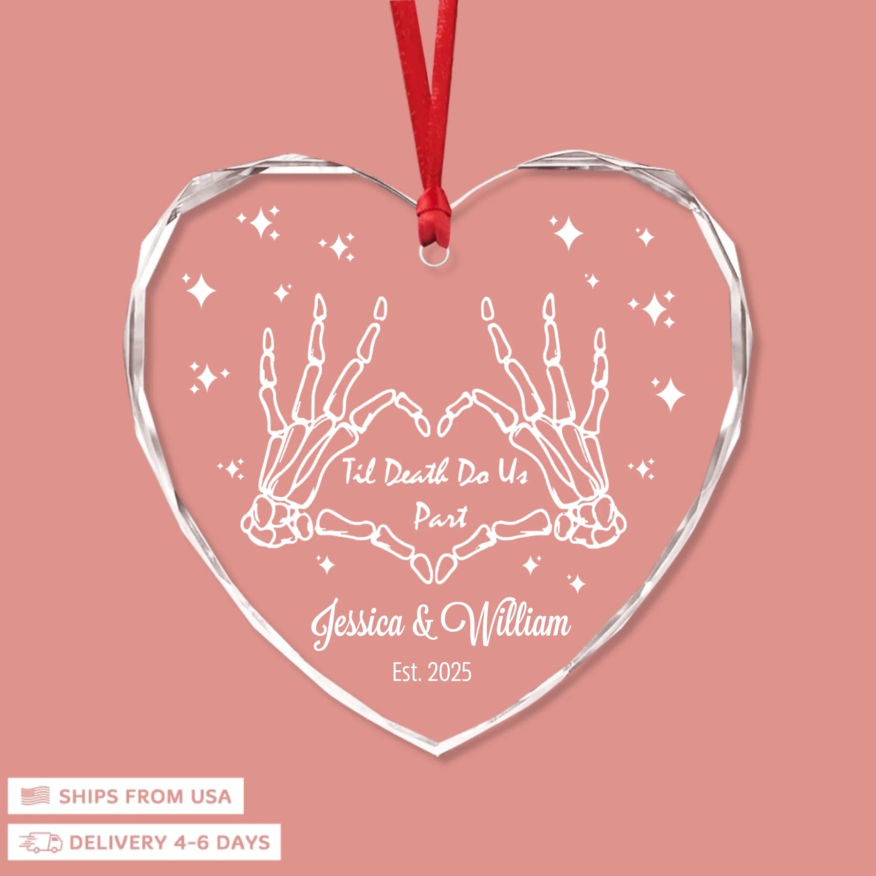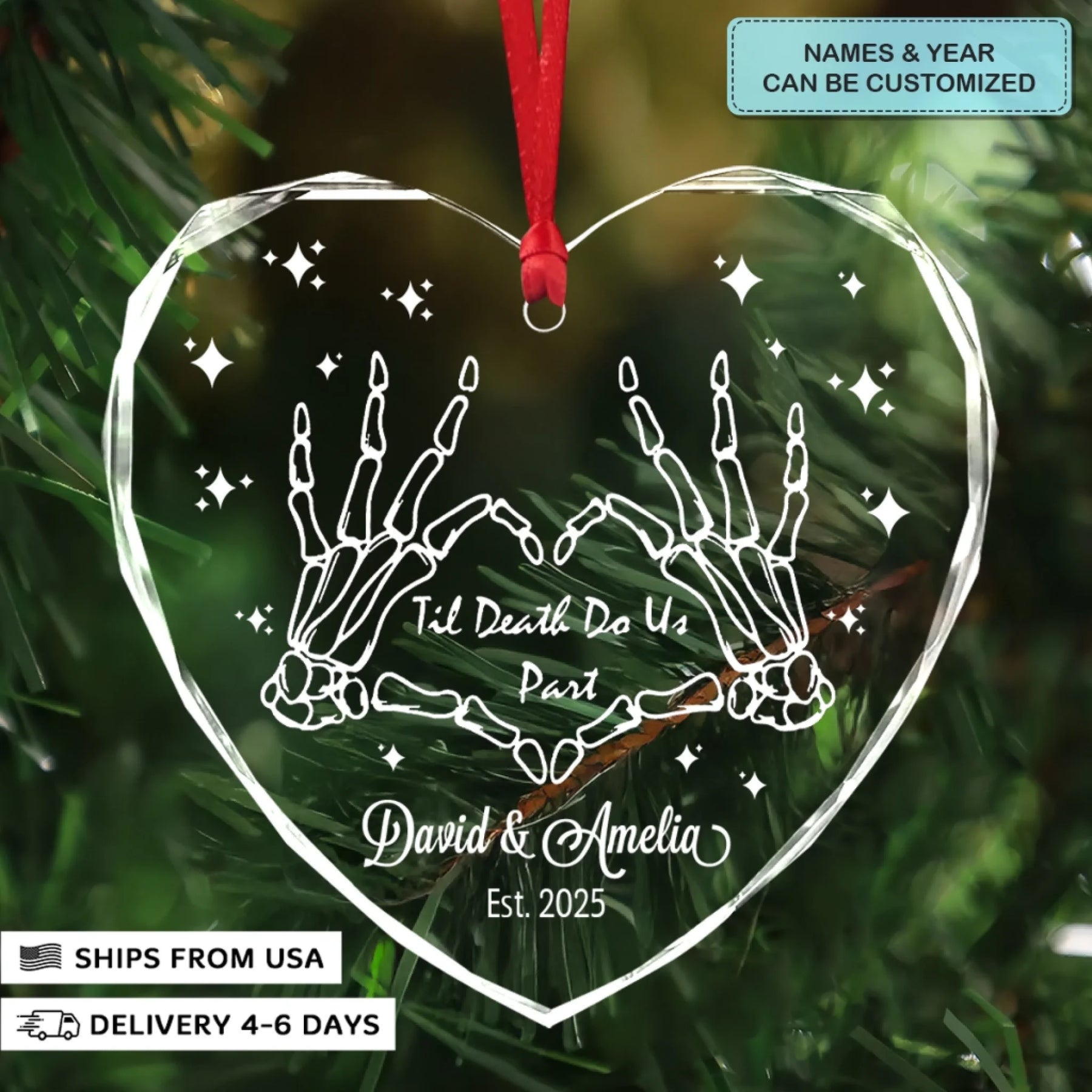 - Packaging: Red satin ribbon for hanging included