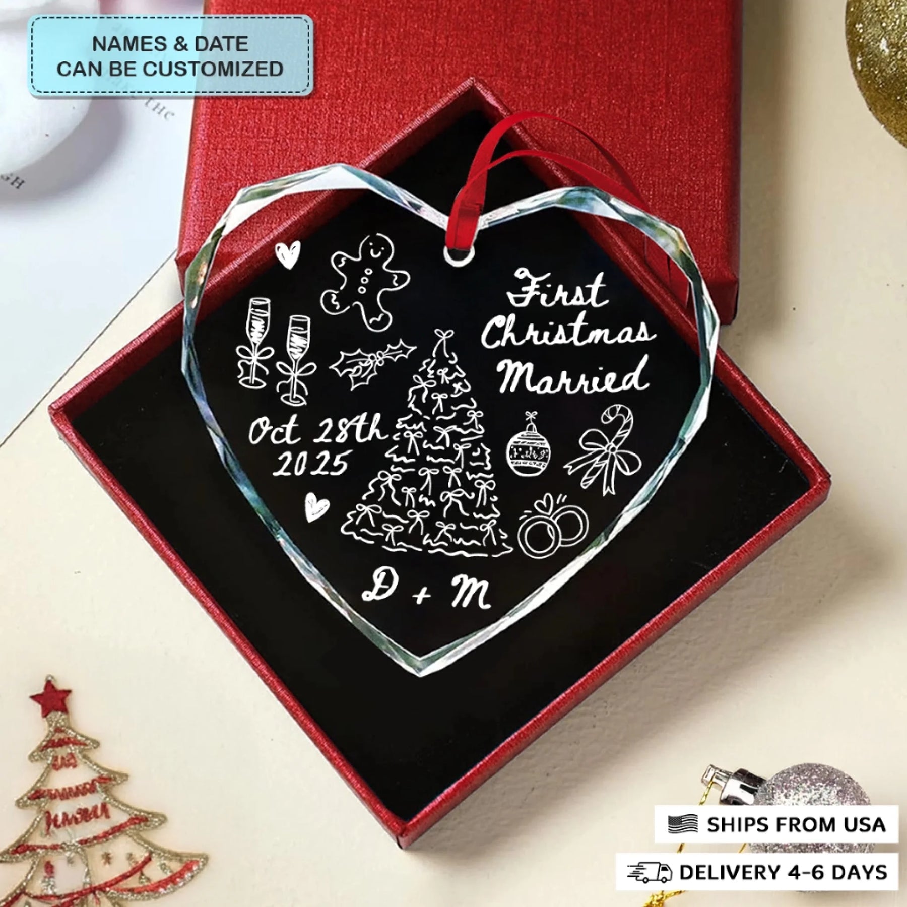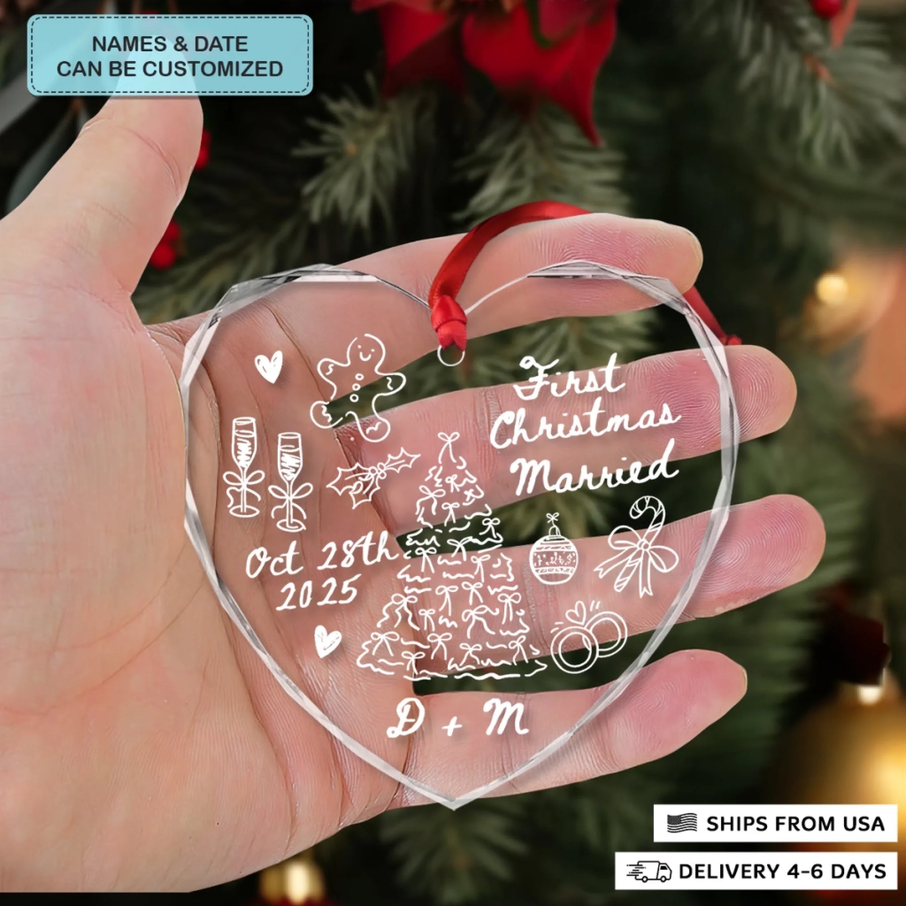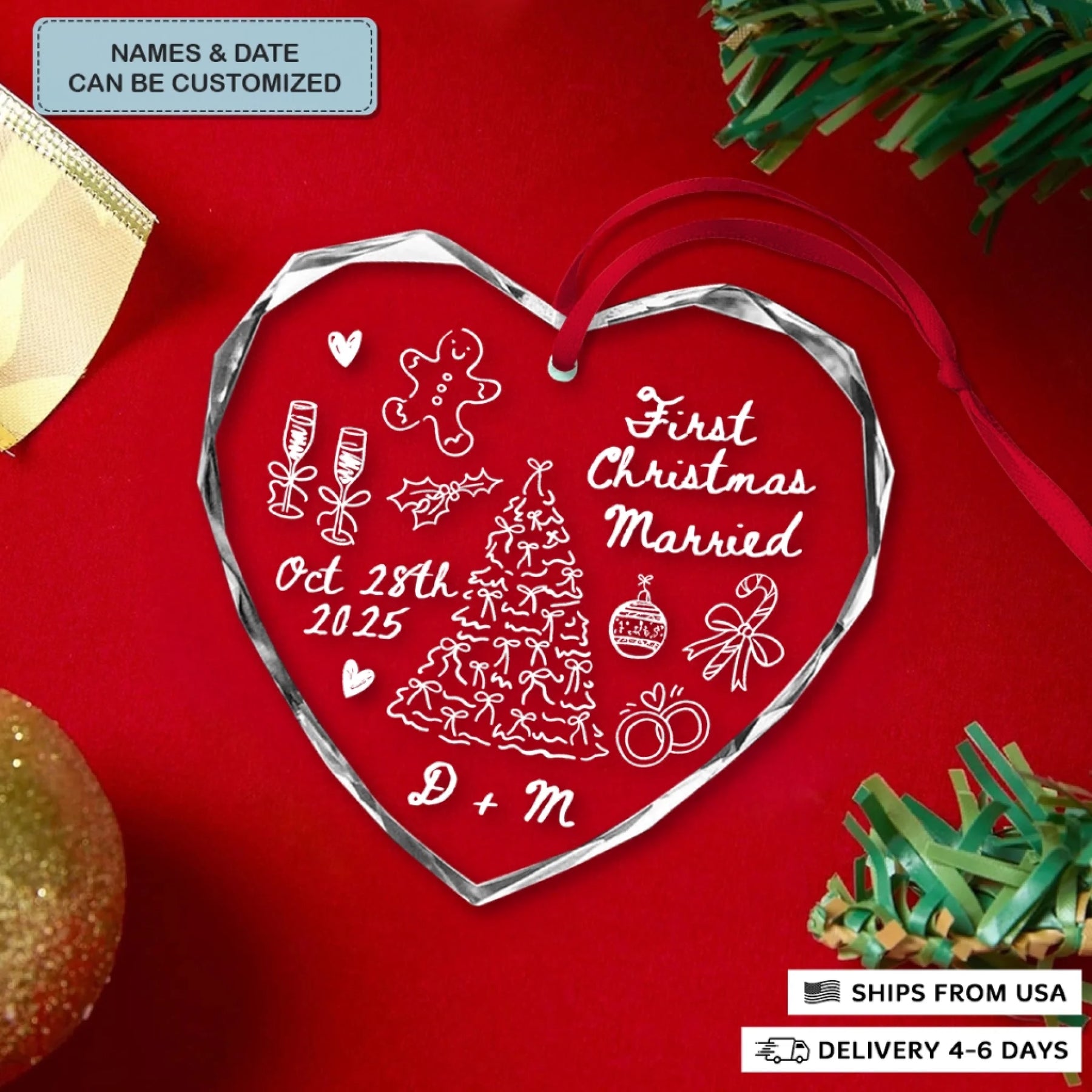 - Packaging: Red satin ribbon for hanging included