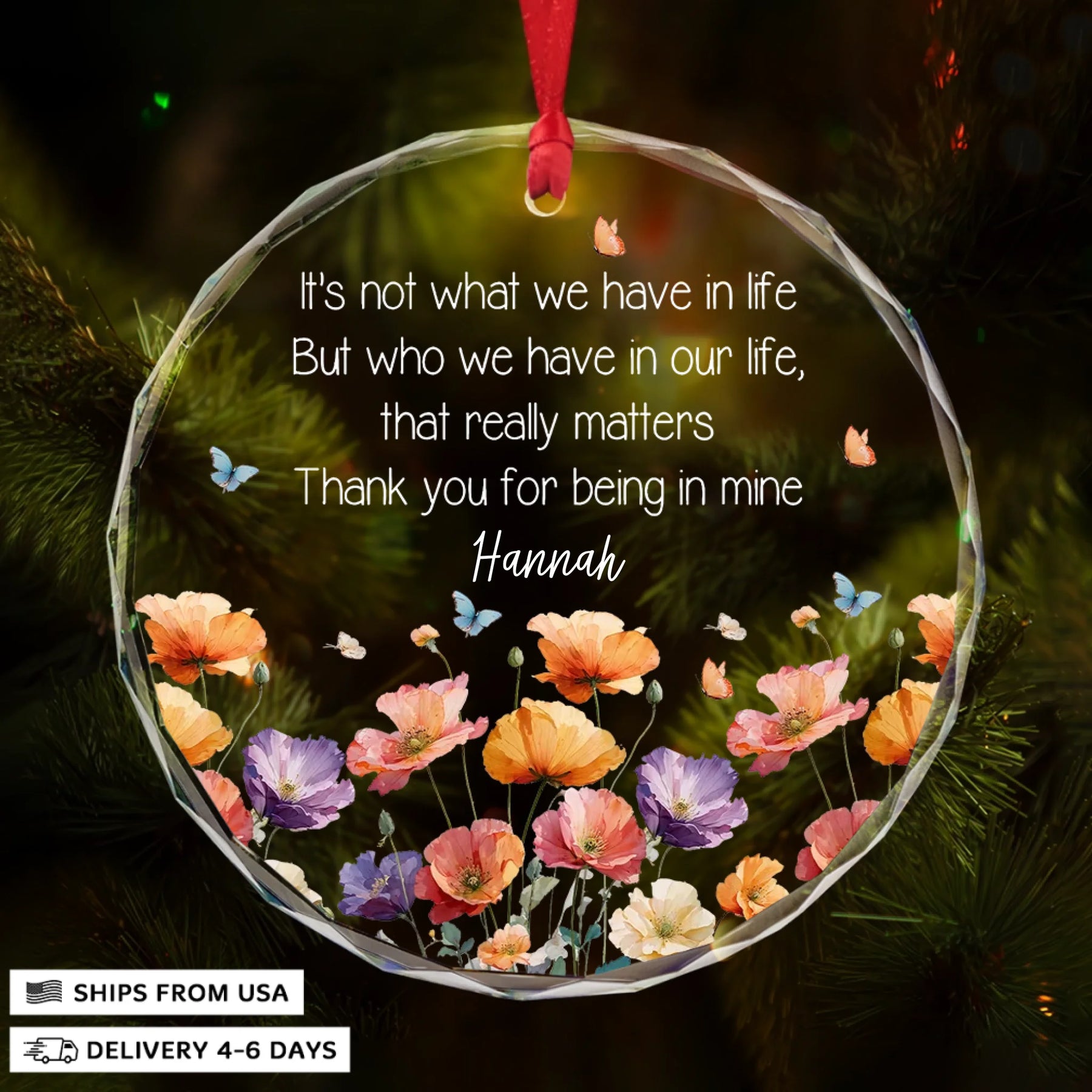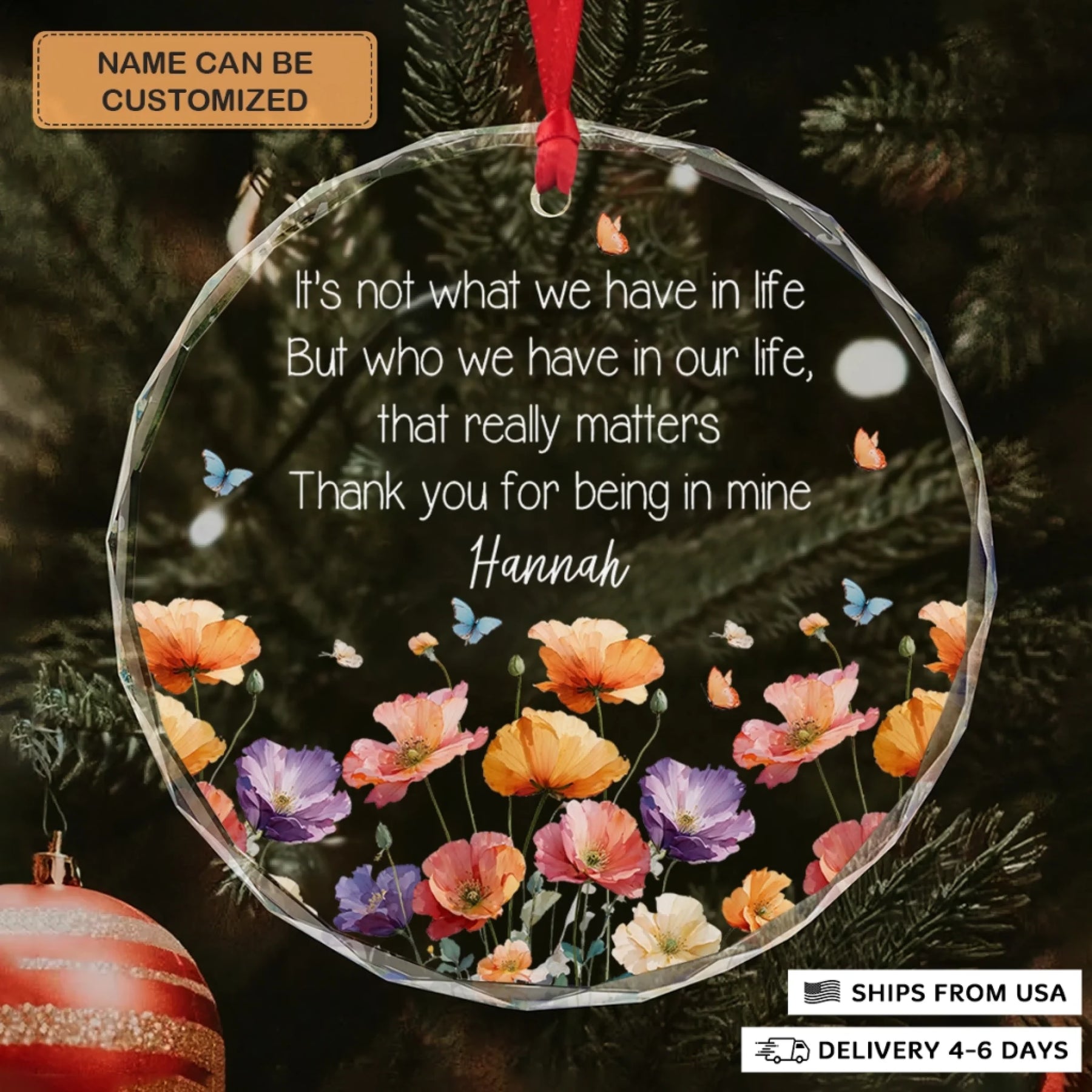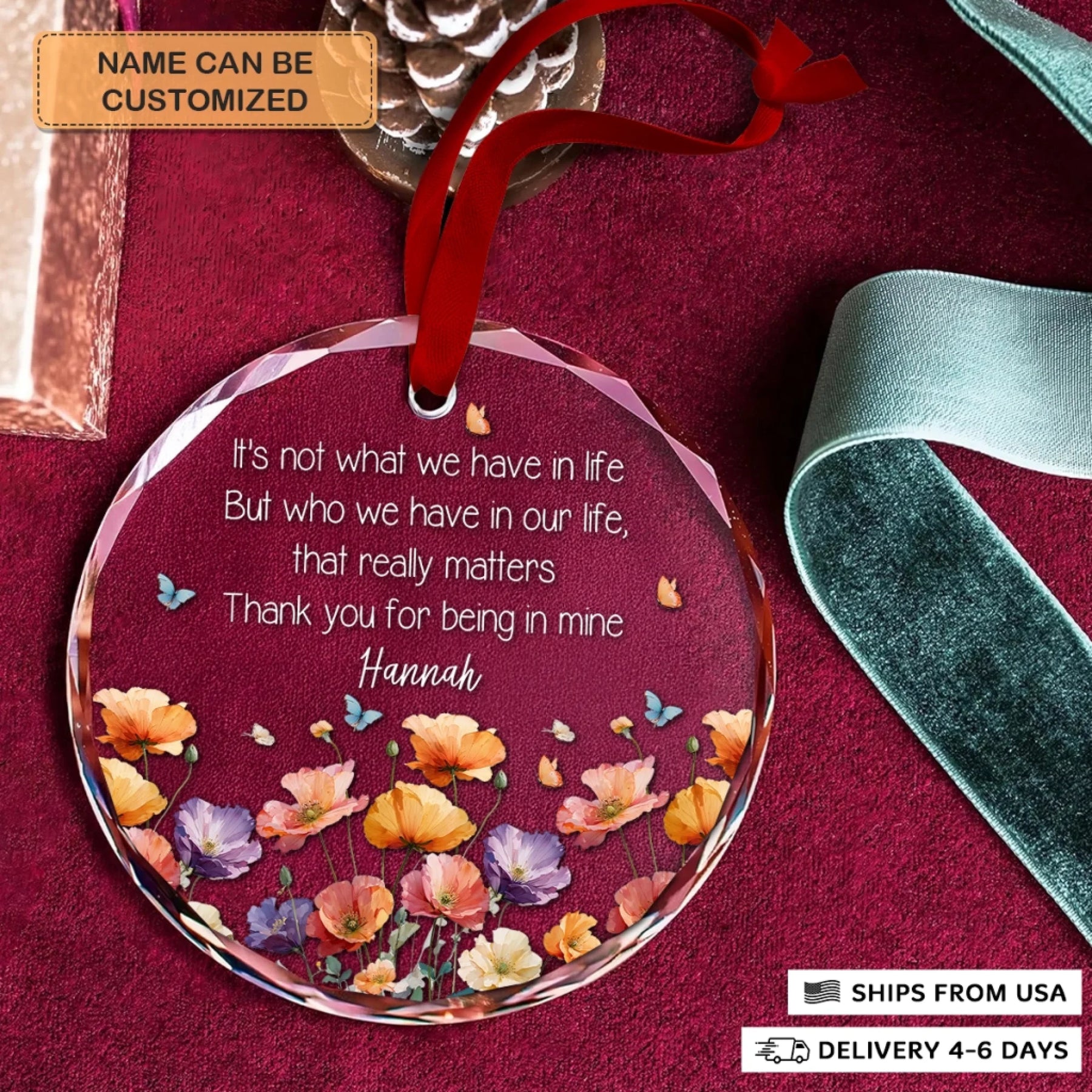 - Packaging: Red satin ribbon for hanging included