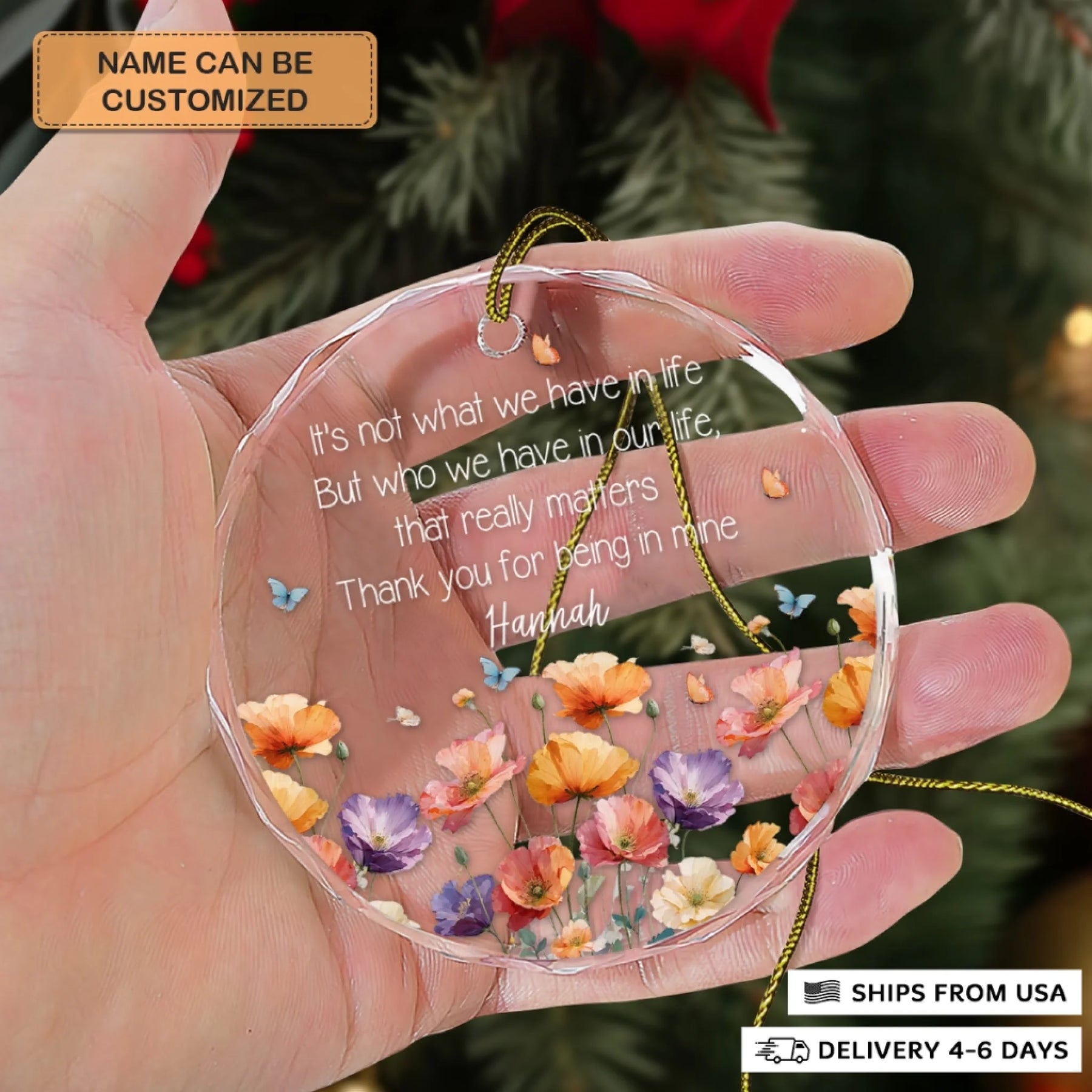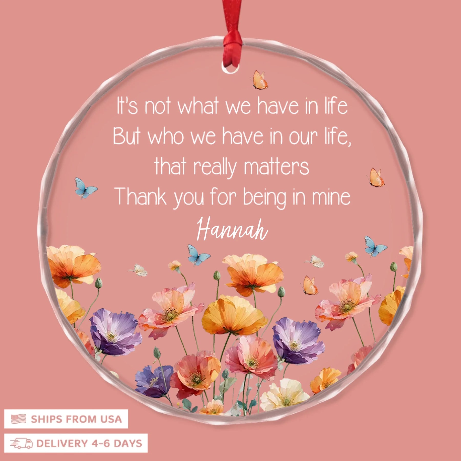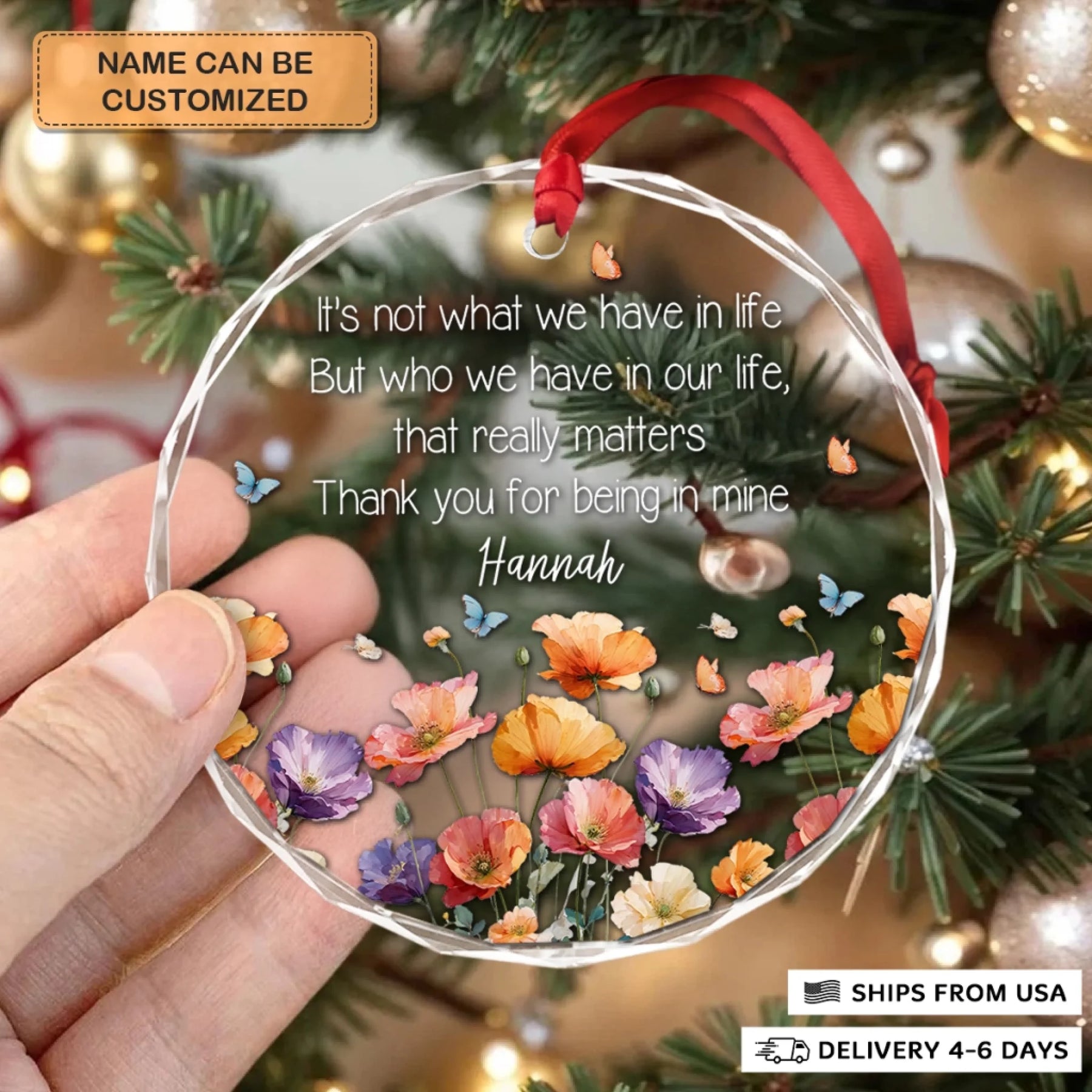 - Packaging: Red satin ribbon for hanging included