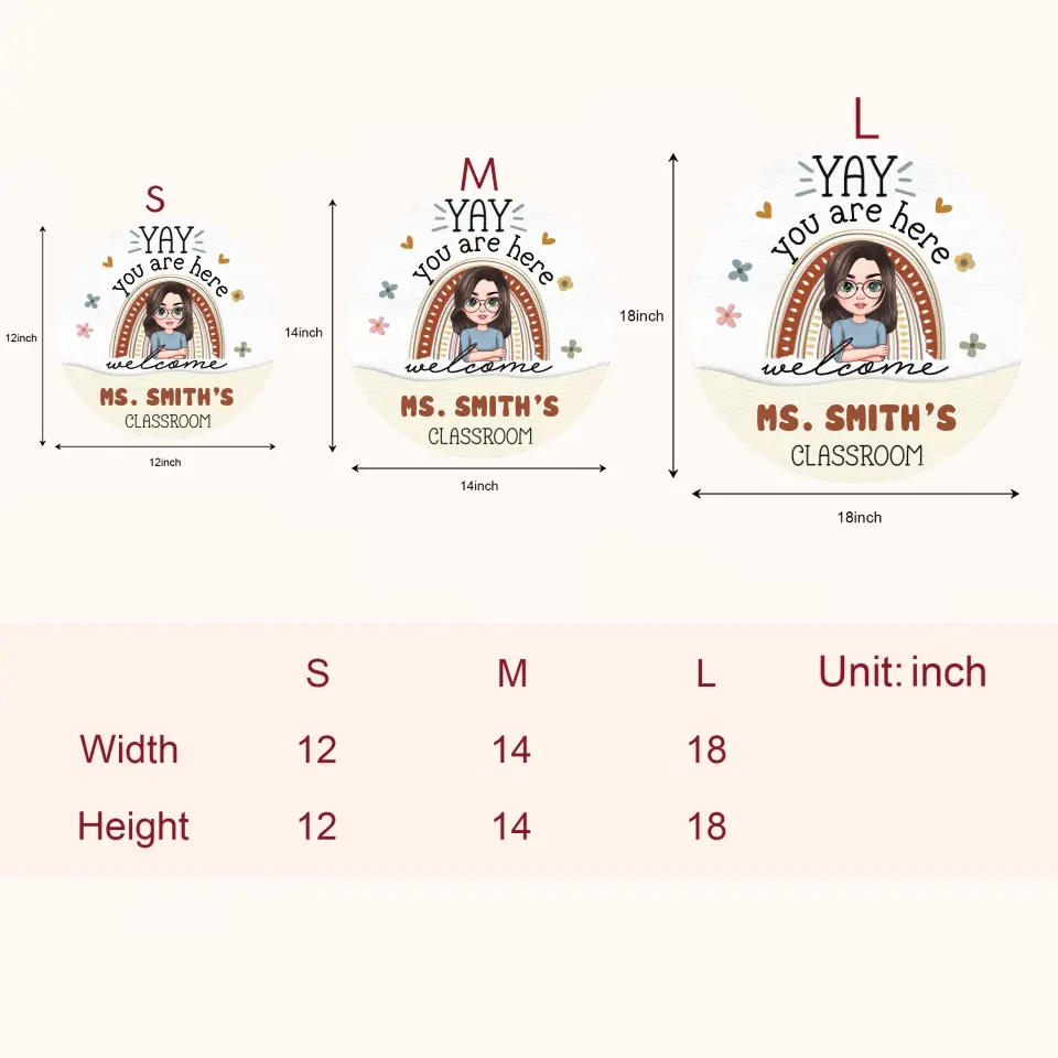 As our products are customized (manufactured after being ordered), the size of the door sign will depend on the shape of the design. The maximal length and width of the door sign are 12, 14 and 18 inches. Please kindly allow a slight difference between the end product and the Preview picture.
