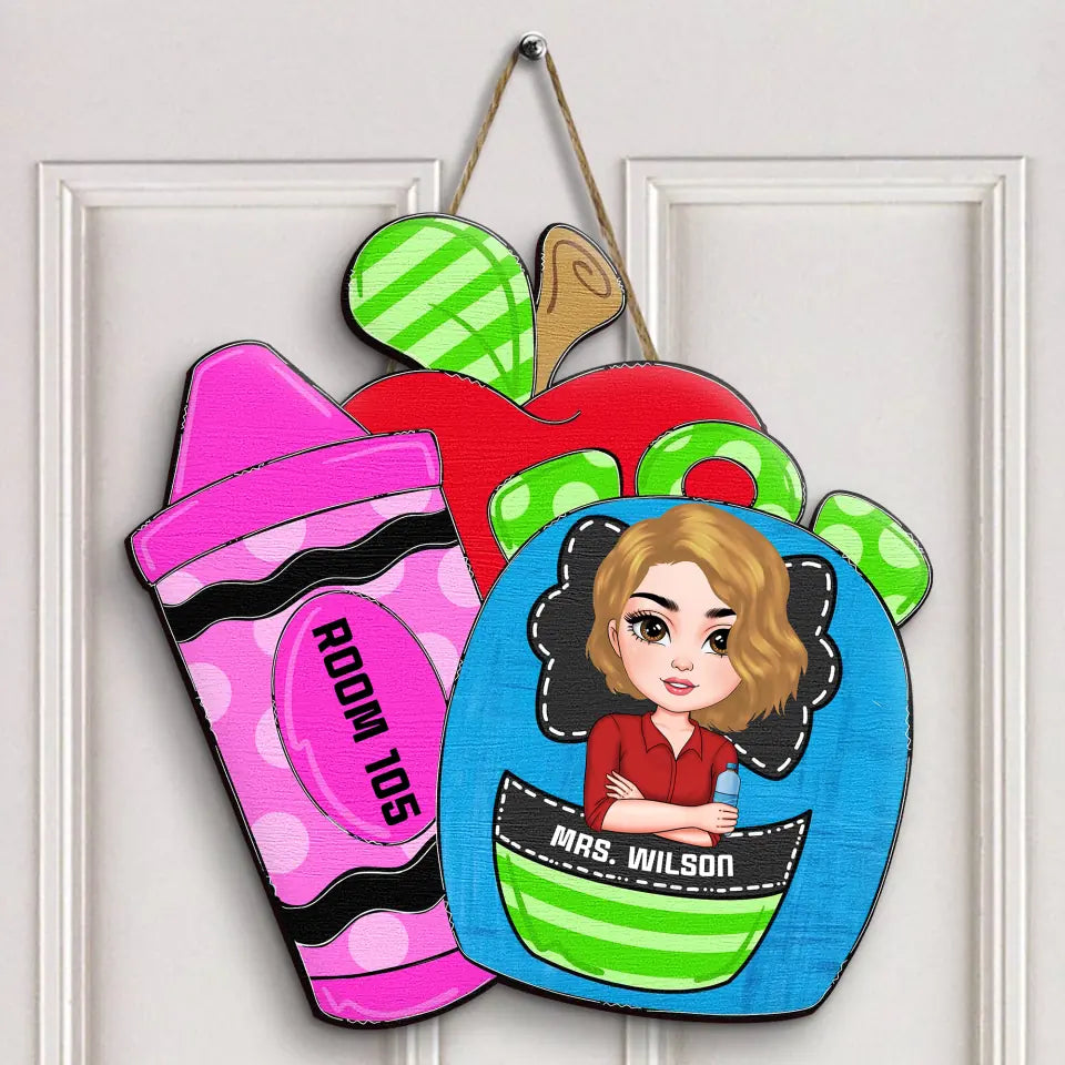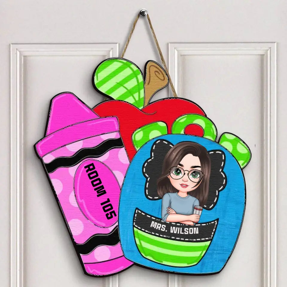Personalized Custom Door Sign - Teacher's Day, Appreciation Gift For Teacher - Colorful Crayon Apple Door Sign