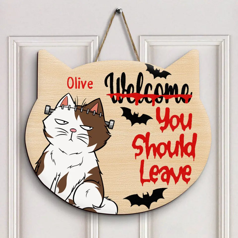 Welcome You Should Leave - Personalized Custom Door Sign - Halloween Gift For Cat Lover, Cat Mom, Cat Dad