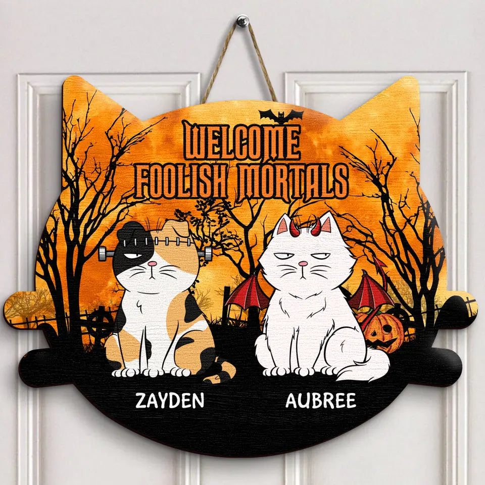 Welcome Foolish Mortals - Personalized Custom Door Sign - Halloween Gift For Cat Mom, Cat Dad, Cat Lover, Cat Parents
