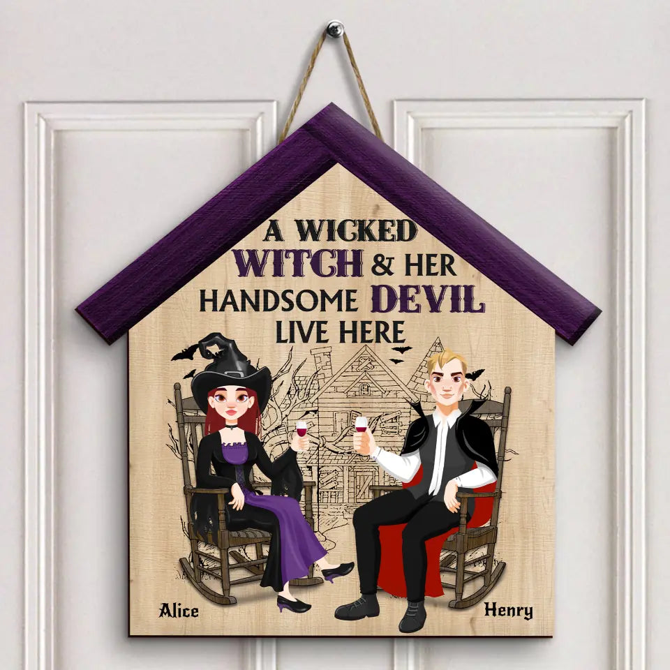 Halloween A Wicked Witch And Her Handsome Devil Live Here - Personalized Custom Door Sign - Halloween Gift For Couple