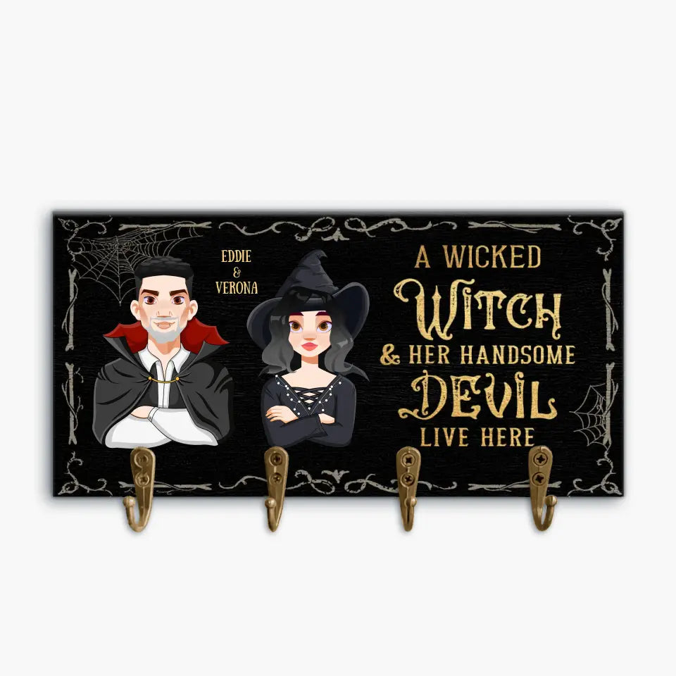 A Wicked Witch And Her Handsome Devil Live Here - Personalized Custom Key Holder - Halloween Gift For Couple, Wife, Husband
