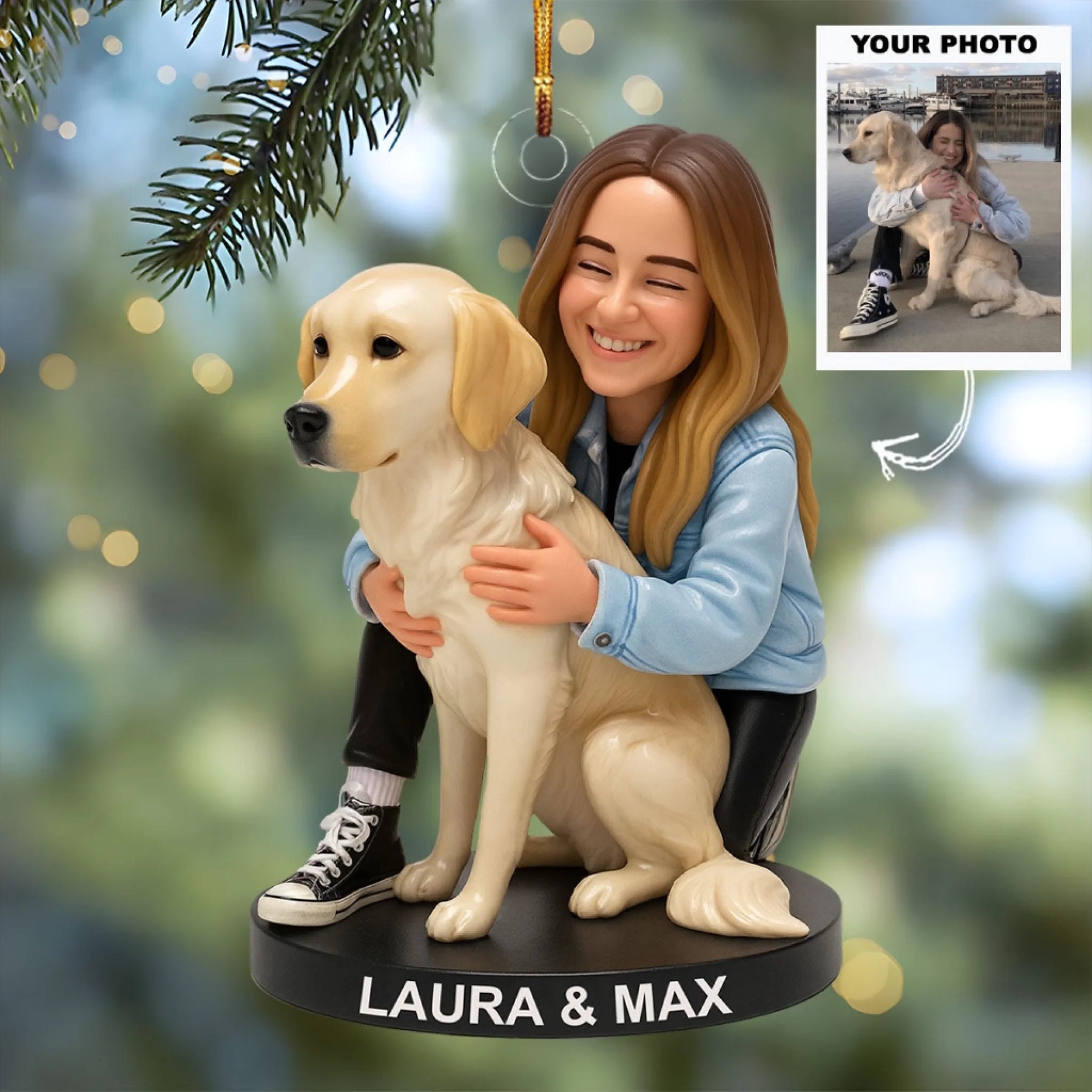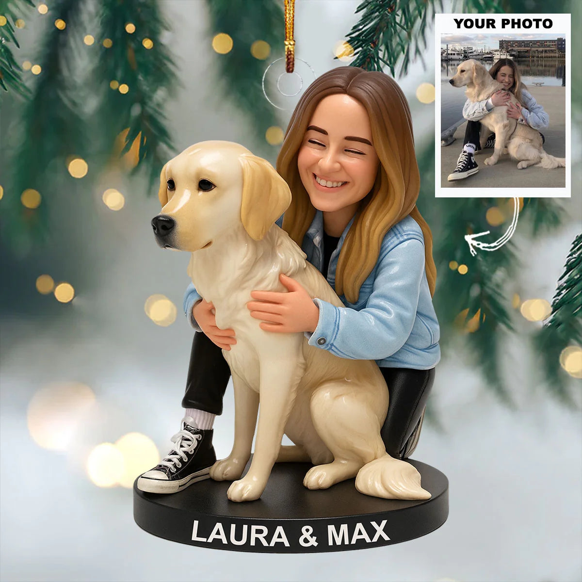 Our custom ornaments are made in an artistic cartoon style, following a similar pose and style as shown in our examples. Final colors, details, and expressions may vary slightly and won’t be an exact replica of your photo.