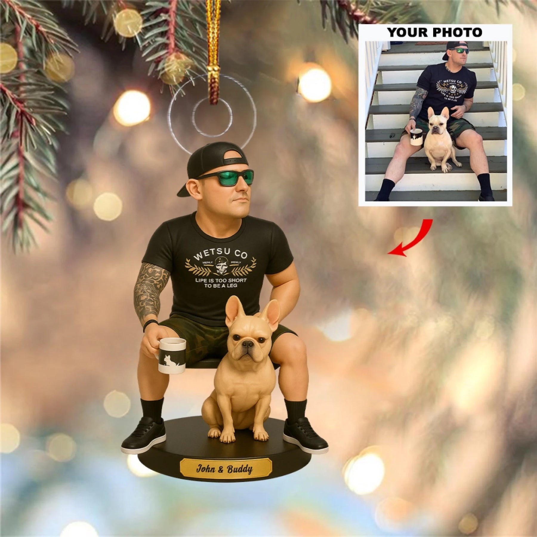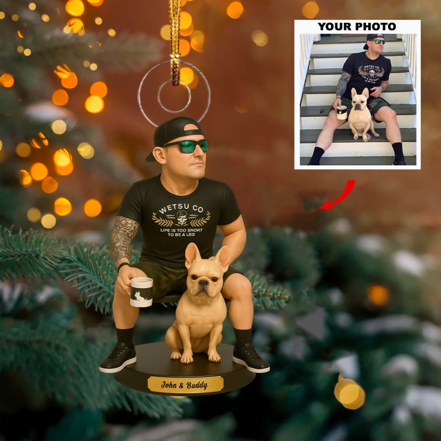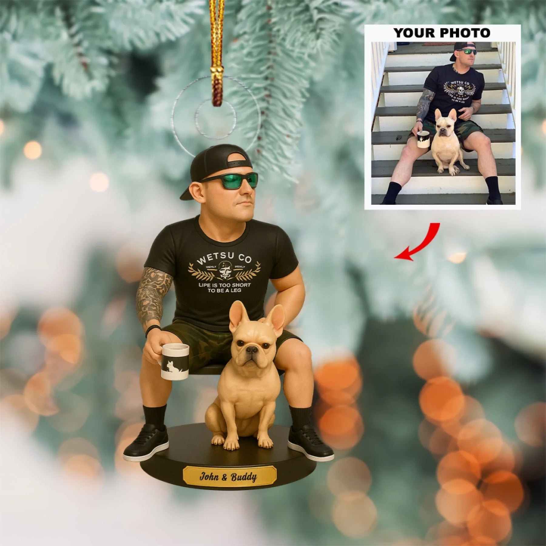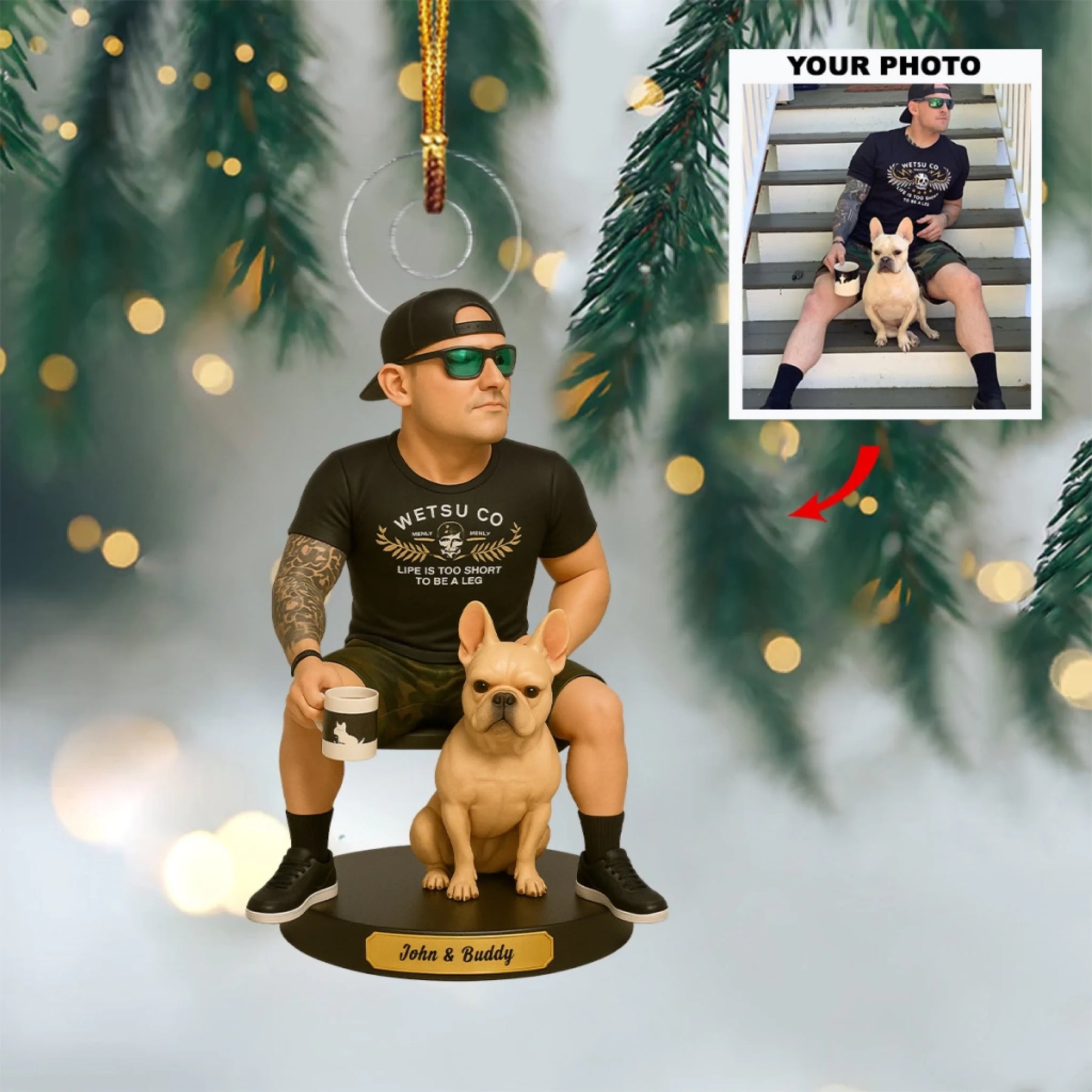 Our custom ornaments are made in an artistic cartoon style, following a similar pose and style as shown in our examples. Final colors, details, and expressions may vary slightly and won’t be an exact replica of your photo.