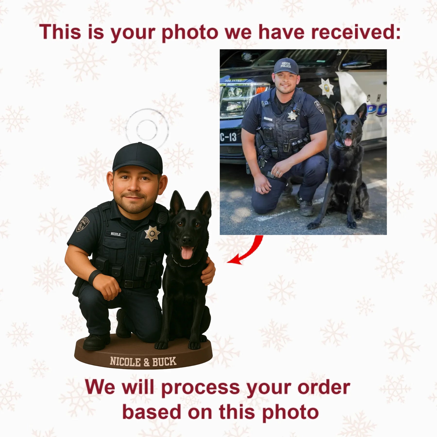 NOTE: Our custom ornaments are made in an artistic cartoon style, following a similar pose and style as shown in our examples.