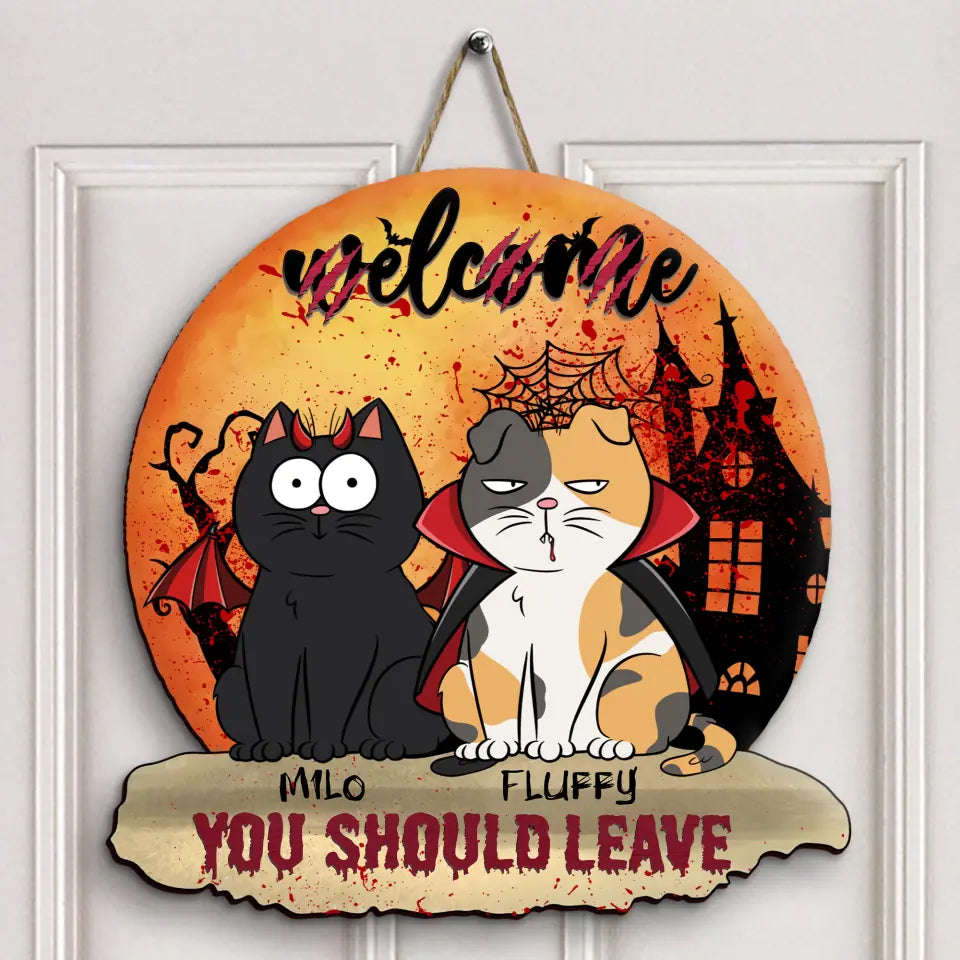 Welcome, You Should Leave - Personalized Custom Halloween Welcome Sign - Halloween Gift For Cat Mom, Dog Dad, Pet Owner