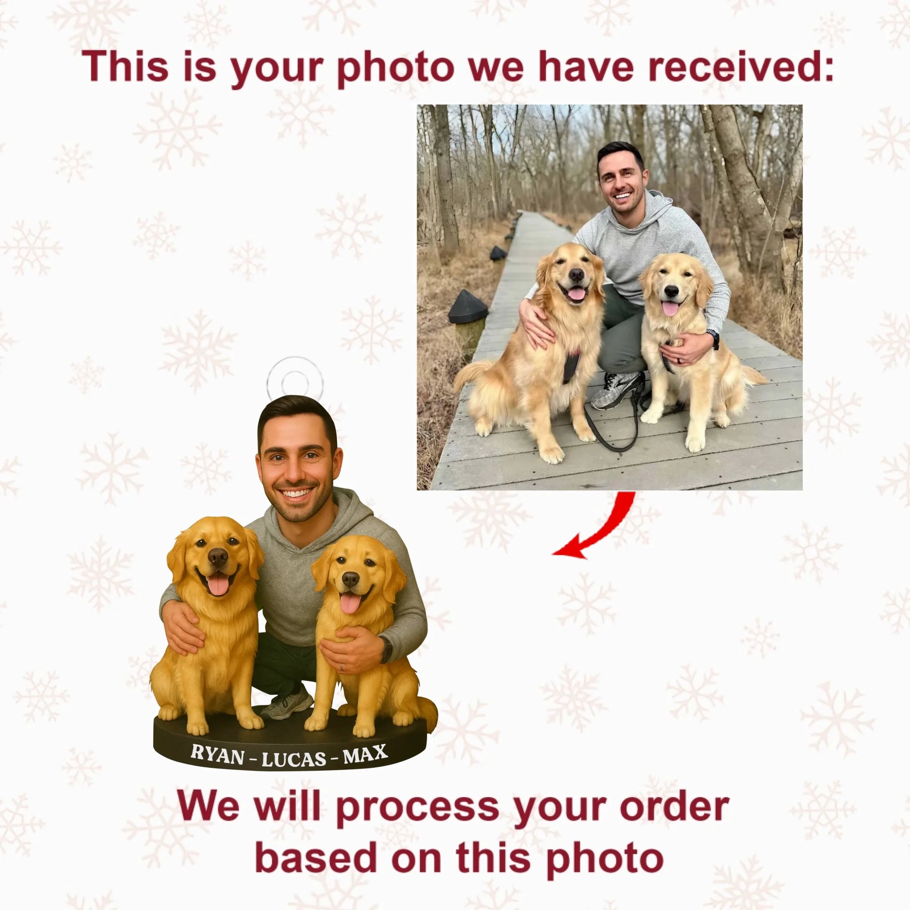 NOTE: Our custom ornaments are made in an artistic cartoon style, following a similar pose and style as shown in our examples.